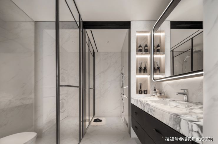 颜值MVP:四分离卫浴设计,实现独立洗漱台、卫生间、淋浴间、洗衣区互不打扰,晨起高峰也能从容有序。家政空间藏于其中,解放了阳台,让其更多承载尺度观景功能。