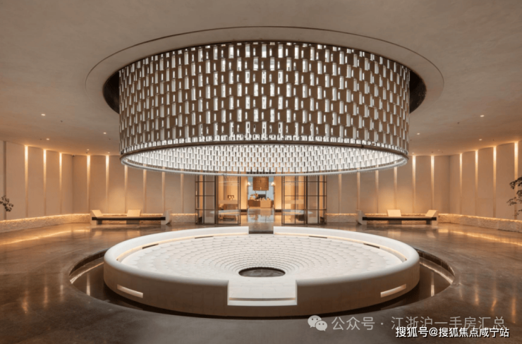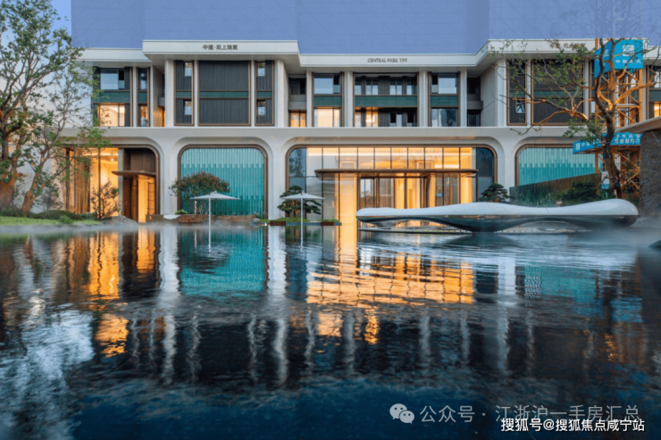 浮光池院水院会客厅,现已实景呈现,水景中央的艺术小品,如一滴水在湖面晕开,泛起阵阵涟漪。