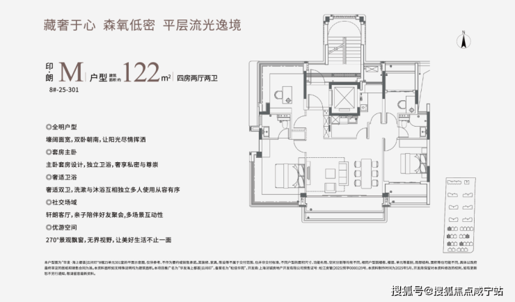 建面约122㎡的中叠四房,大平层式设计,宽尺横厅+阳台+270°主套飘窗采光条件极佳,每天早晨都被阳光晒醒。