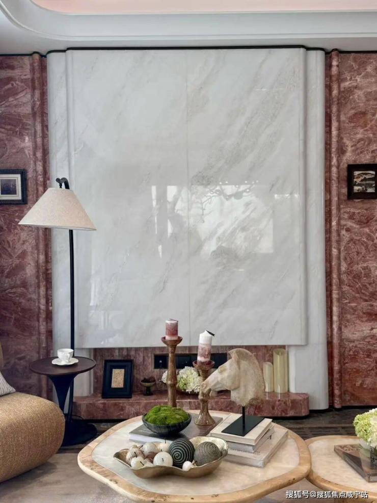 电视背景墙堪称视觉焦点,安妮白玉大理石搭配意大利米兰红大理石,白色基底交织精致灰纹,红色底色映衬独特纹理,每一块石材都是天然的艺术画作,老钱气质瞬间拉满。