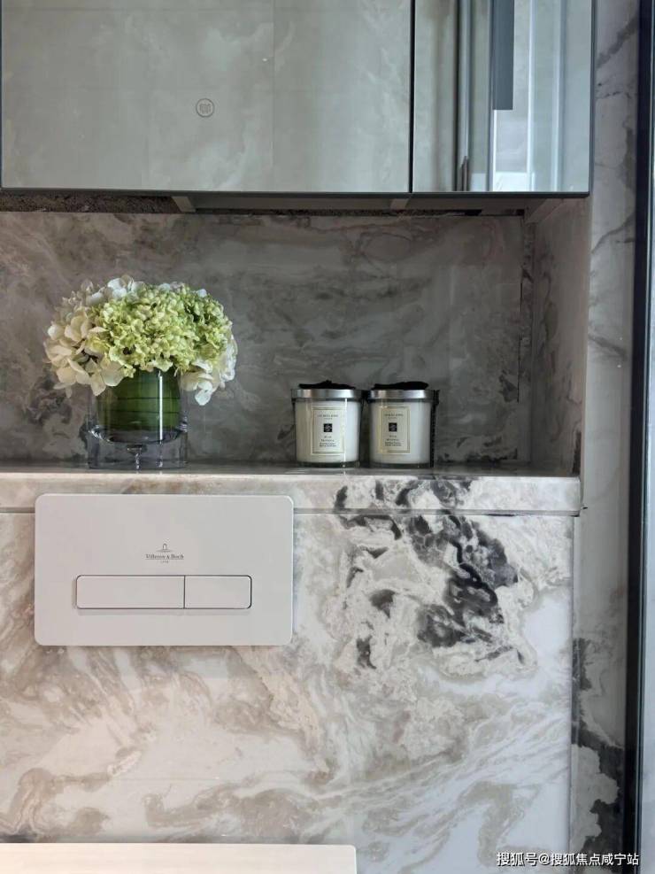 主卫更是亮点纷呈,罗马 FENDI 酒店同款的芬迪白大理石,作为背景墙与台盆材质,底色如脂如玉,纹理立体丰富。