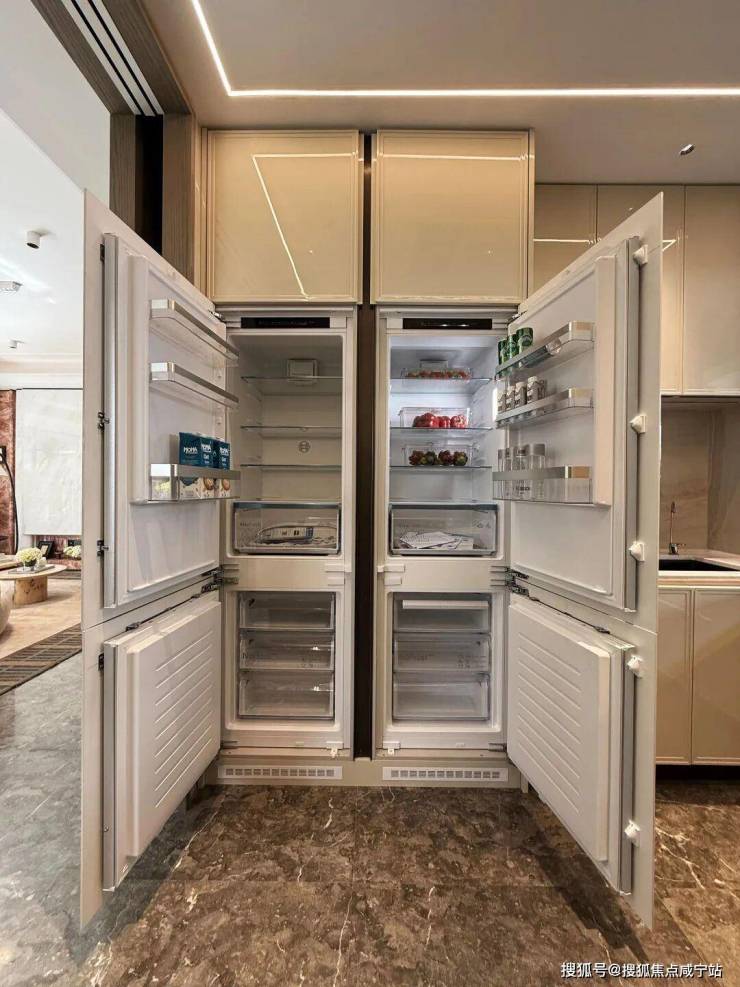 转身来到厨房,钢琴烤漆工艺的橱柜质感细腻,一整套博世厨电油烟机 + 三眼燃气灶 + 洗碗机 + 蒸烤一体机!