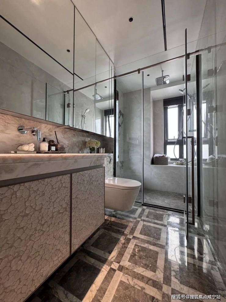 三个卫生间均为明卫设计,地面、墙面分别采用意大利白金沙大理石与直纹白玉岩板铺装,淋浴间的酸洗面星耀灰大理石低调奢华。