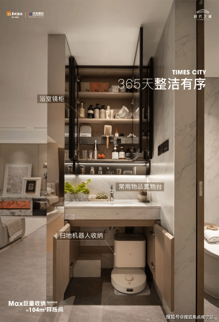 客卫的干区,上方浴室镜柜,中间置物台,下方可收纳扫地机器人。