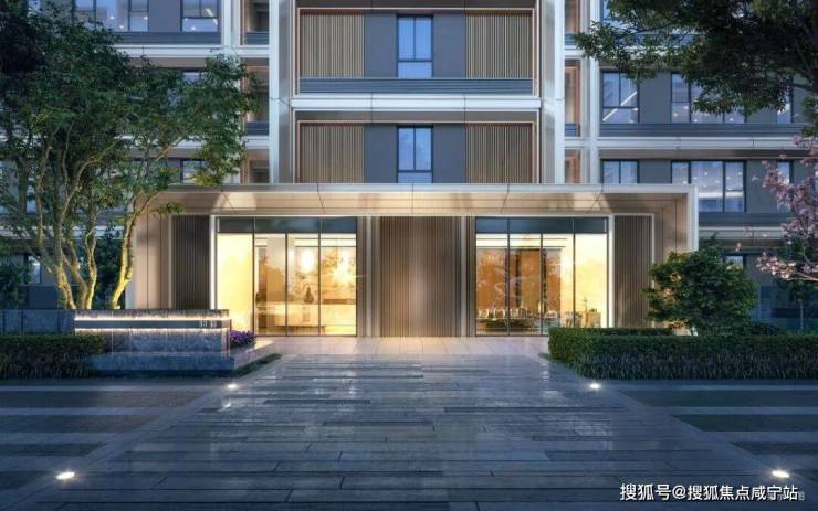 尺度大气的现代风格门头,入口展现艺术水苑、叠水瀑布以及层级绿化,彰显归家仪式感。