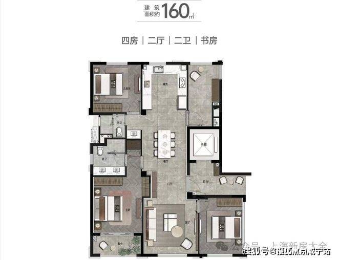 160㎡四房:客餐厨一体化+主卧套房+超大阳台。