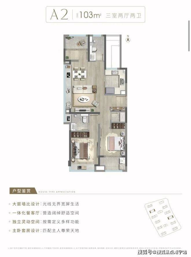 1)建面约103㎡3房2厅2卫边套户型
