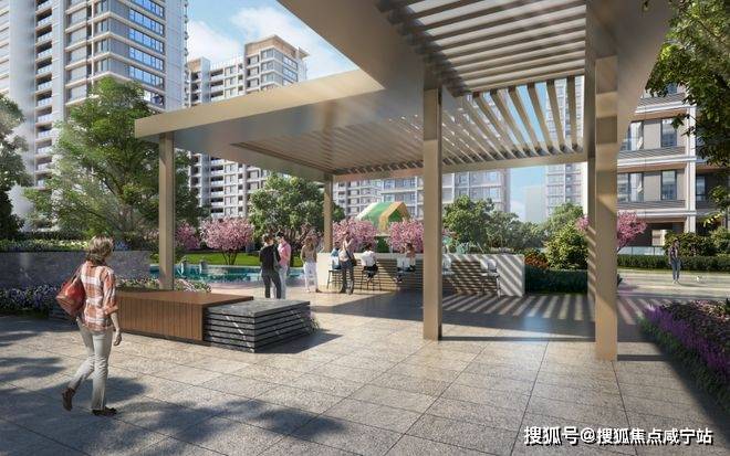沿途设有尊享景观连廊,串联迎宾水景、休闲座椅、林下休憩空间。