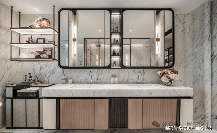 如宝格丽大理石打造的西厨岛台、铂浪高的净水三合一水龙头和一体式大水槽、霍尼韦尔的前置过滤器、全屋软水以及末端净水器系统、来自意大利法罗力燃气热水器、德国唯宝卫浴、当代龙头及花洒......还有全屋华为智能家居系统配置。这一套组合,是真正意义上的顶豪序列配置!
