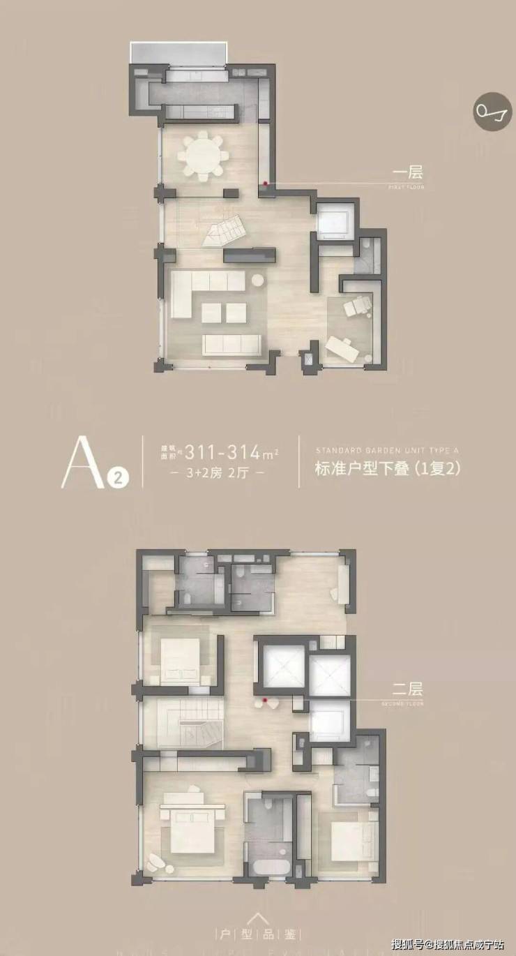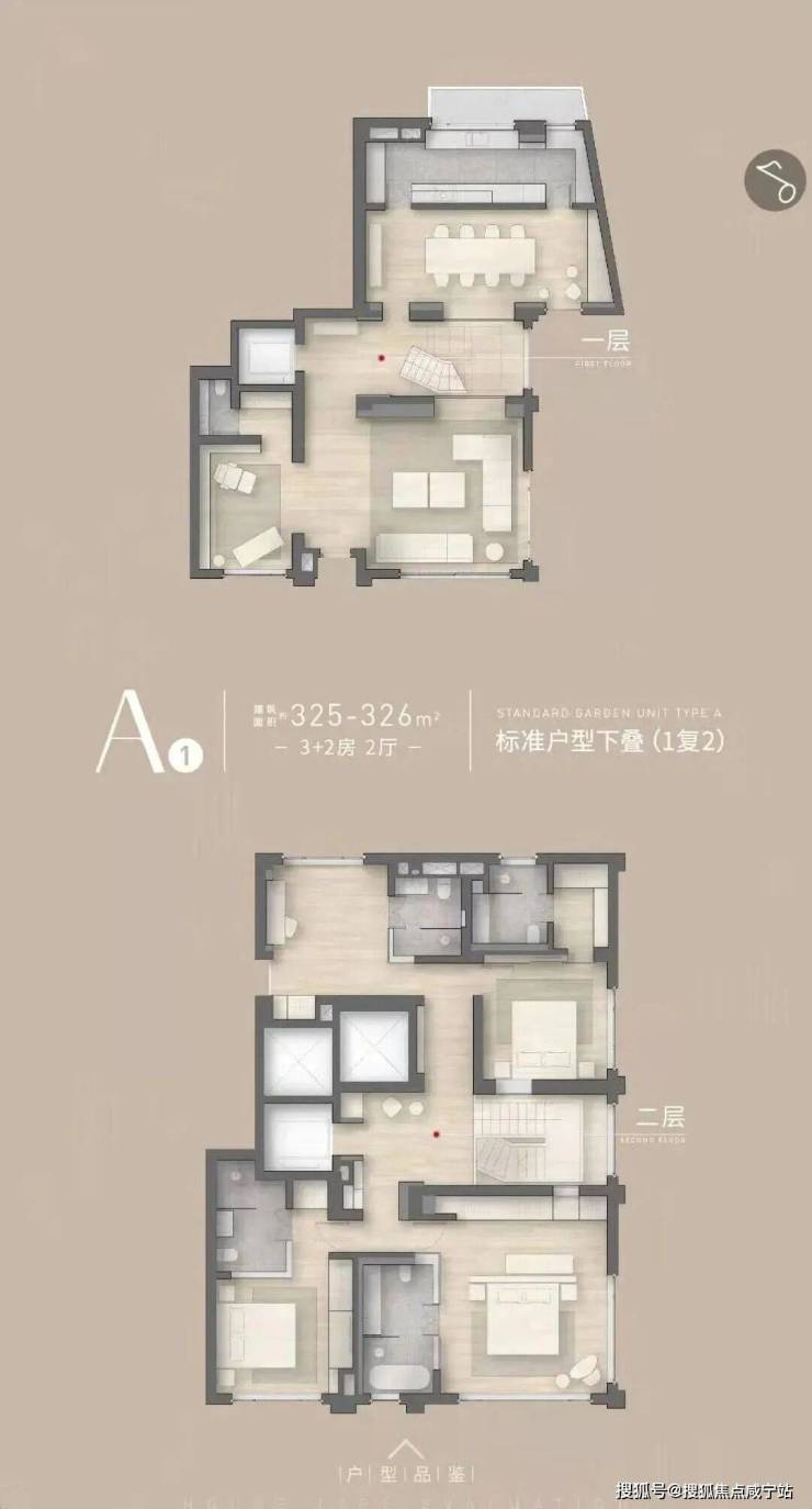 A1下叠:约325㎡,三室两厅五卫,首层设开放式厨房与客厅