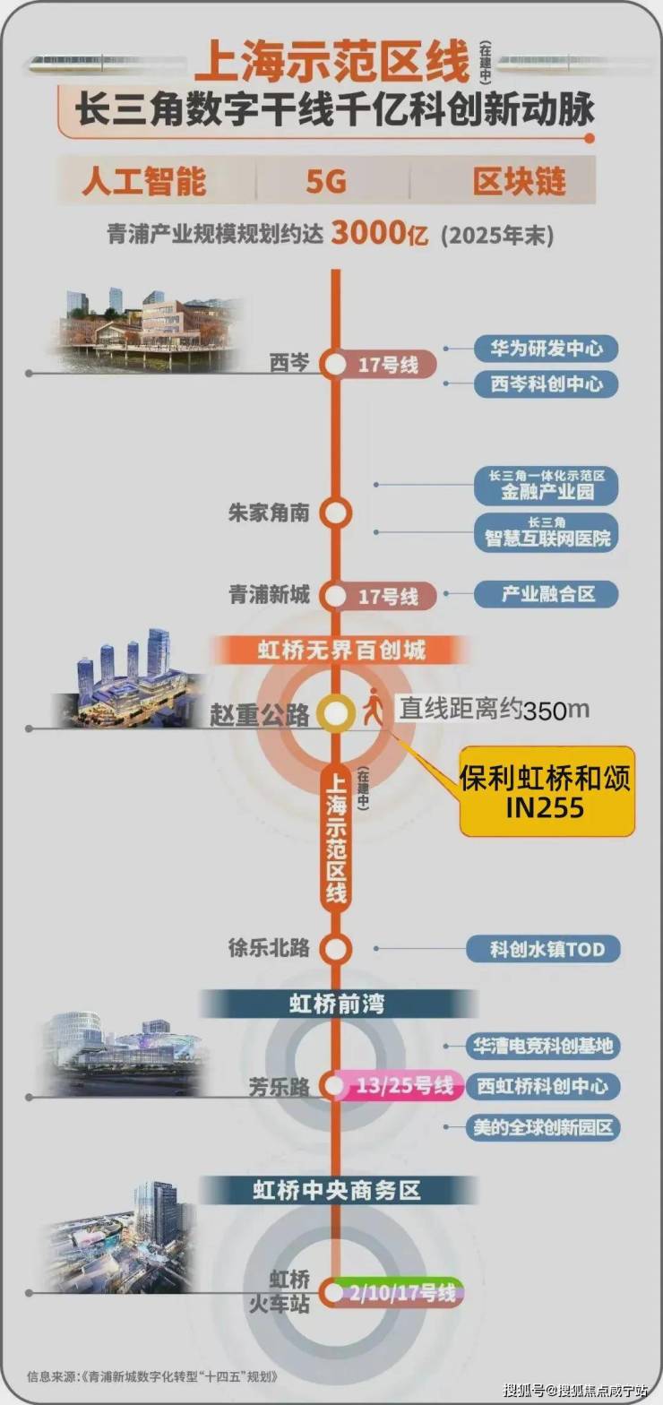 视角回到保利虹桥和颂·IN255,项目与示范区线赵重公路站直线仅有约350米,其位置更是在规划能级较高的西虹桥南部