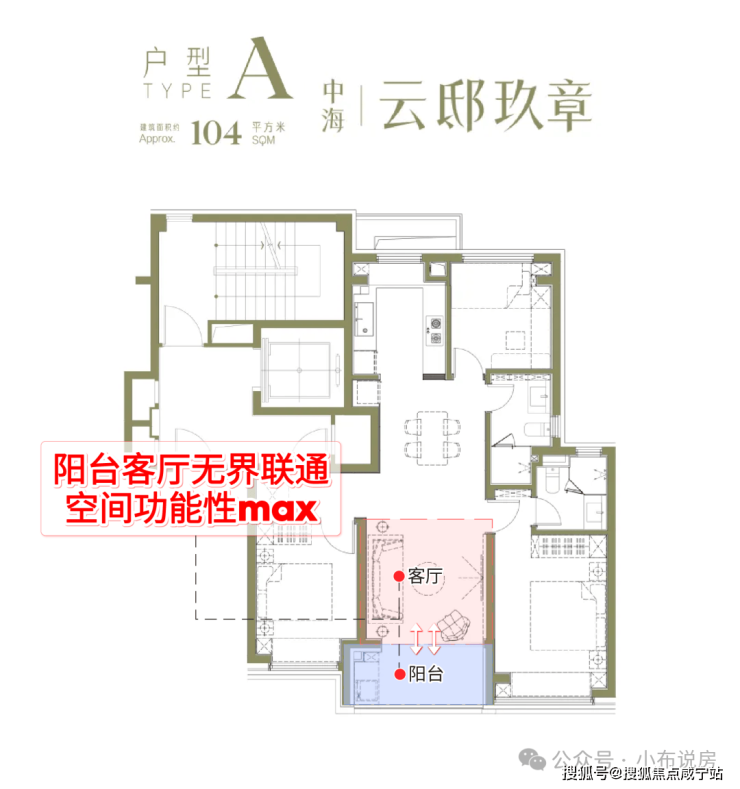 飞机户型公区的贯通性被加强,从北到南,厨房、餐厅、客厅、阳台全部打通,尤其是阳台和客厅紧密相连无界连通,空间感功能性拉满!