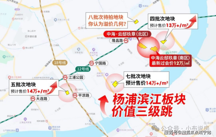 今年的杨浦滨江摁下房价加速器,土拍经历从6.9万/㎡—9.2万/㎡,涨约30%!新房未来预计也将迈上13-14万/㎡!