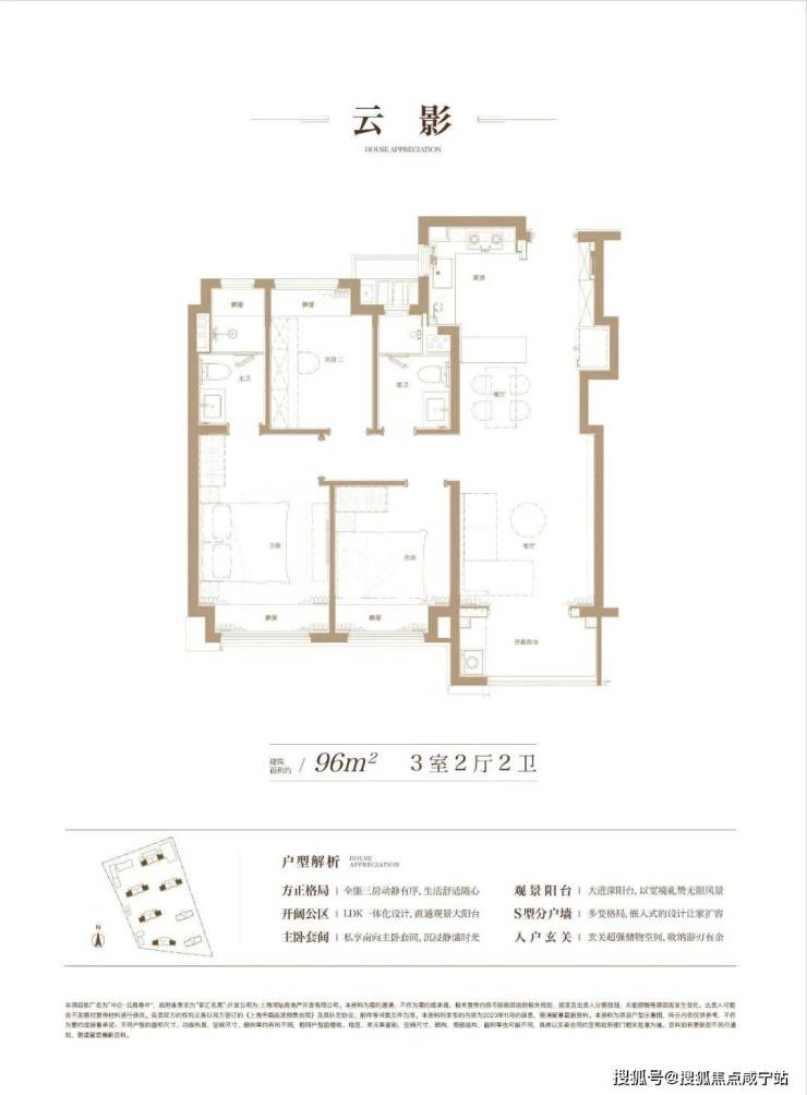 96㎡户型设计最令人惊艳,它充分从居住者的角度考量生活动线、舒适度与生活感。3开间朝南,视野开阔出众,同时主卧套房合理,保证了主人的私密空间。