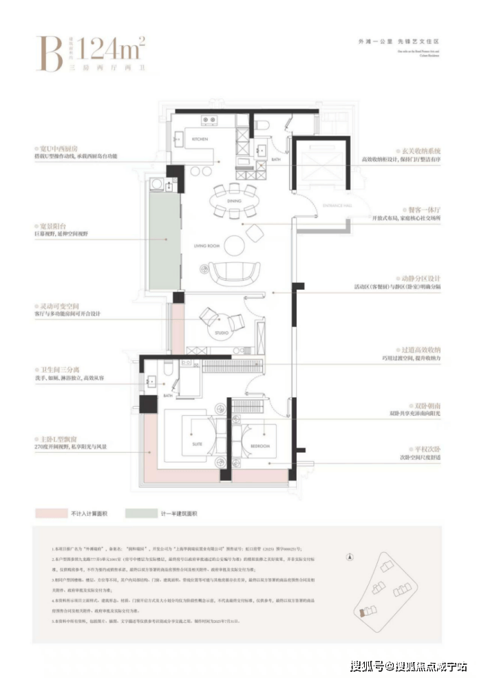 建面约124㎡的边厅“全景舱”户型,是外滩板块极致稀缺的臻品。它以三房布局满足主流家庭需求,更以无遮挡的视野与巨幕般的边厅落地窗,将城市天际线化为私藏画卷。主卧270°L型飘窗,让阳光与风景成为生活的主角。