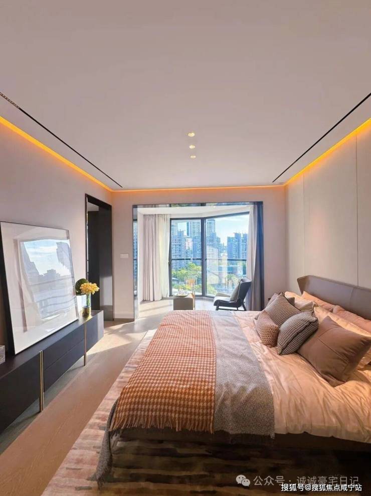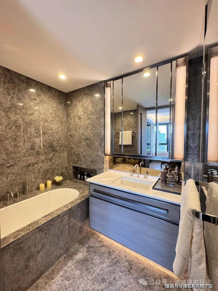 我带你转主卧,嘉盈峰顶复做了双主卧+三次卧+1保姆套间,每个房间都是全套房设计。主卧60㎡,南向面宽6.3米,我伸手按下按钮,电动窗帘缓缓拉开,陆家嘴夜景像IMAX一样扑进来。床背景是意大利Baxter头层牛皮,软包到顶,隔音55分贝。你走进衣帽间,嘉盈峰做了男女双区,女士区带珠宝抽屉、香水冰箱,男士区有手表转塔和领带抽屉,灯光色温3500K,显色指数95,连袜子颜色都不会认错。卫生间更夸张,嘉盈峰顶楼复试标配意大利Antonio Lupi浴缸,容量480L,双循环恒温,泡一小时水不凉,天花板是防水投影仪,可以边泡澡边看《繁花》。
