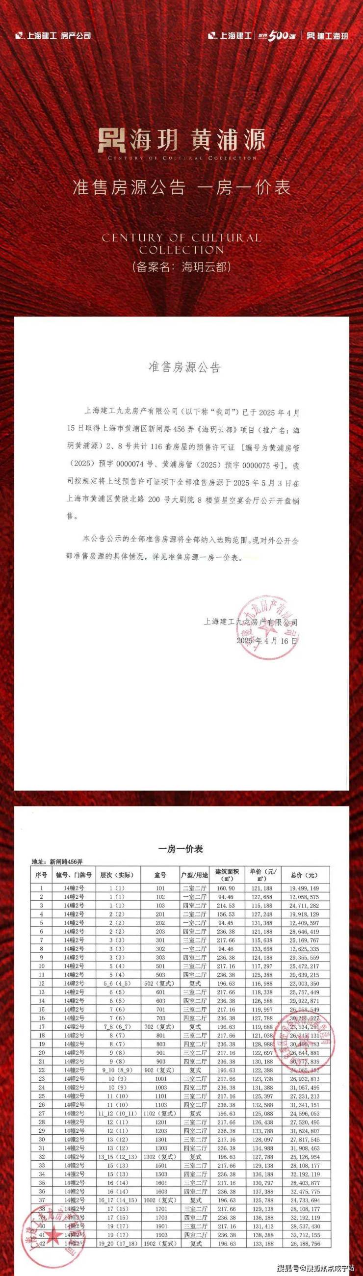 黄浦区「海玥黄浦源」少量建面约193-402㎡多种户型;均价14.56万/㎡!
