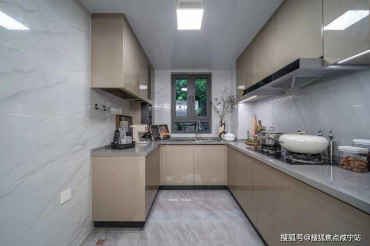 尤其值得一提的点是,在样板间燃气灶后面,项目专门采用了一体化的大岩板,因为很多项目都是采用拼接的瓷砖,使用时间久了,拼接缝是很难清理的,一体化的大岩板就避免了这个问题,这一看就是懂生活、有温度的设计。