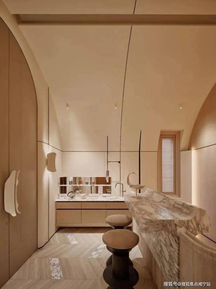 整体以米白色调为主,加入了少许鲜亮橘色,烘托休憩情绪。主卫浴采用双台盆设计,方便双人同时使用,由天然洞石打造的卫浴空间更具有一种低奢隐逸的度假气息。