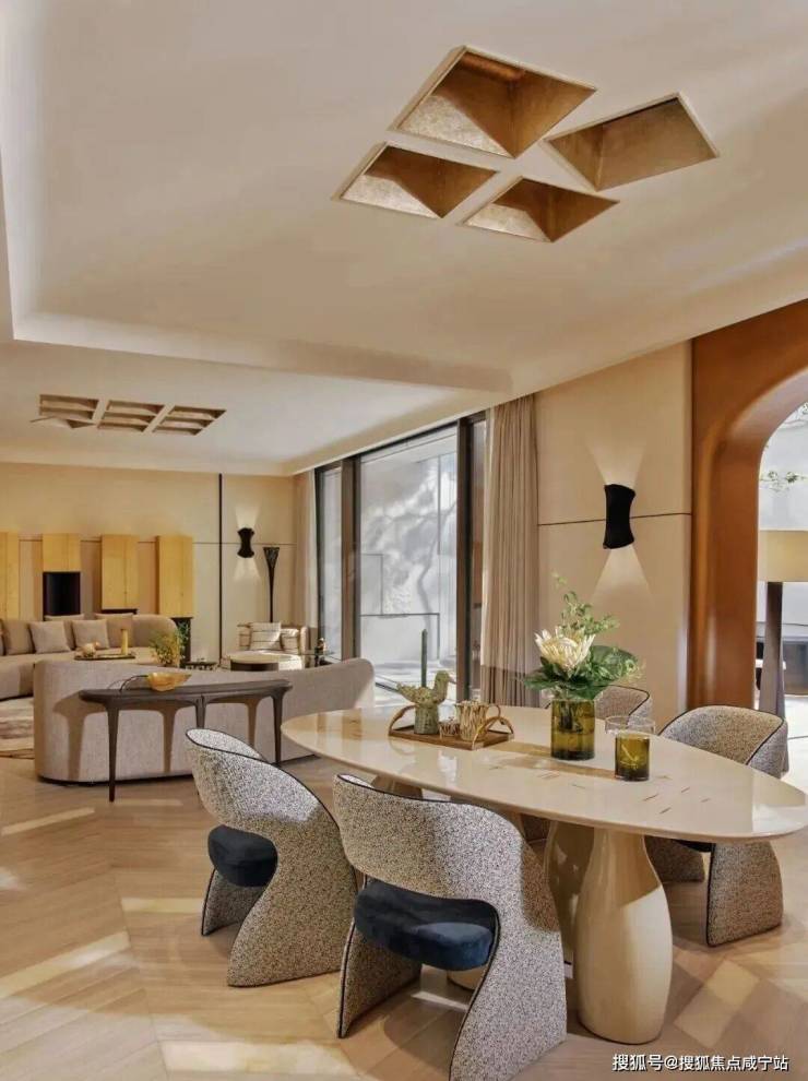 一层室内的天花都特别设计了梯形装置,增加了空间向着顶部不断延伸的纵深感,且镶以手作金箔贴面,浑然天成。