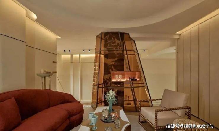 更加别具一格的设计在上方的负一层创意临展空间,透明的茶色玻璃壁炉贯穿于此,金属镶边与定制家具相应和,与华丽红沙发一道,应和着海派Art Deco风情,延展出融合历史与文化格调的能量回旋。