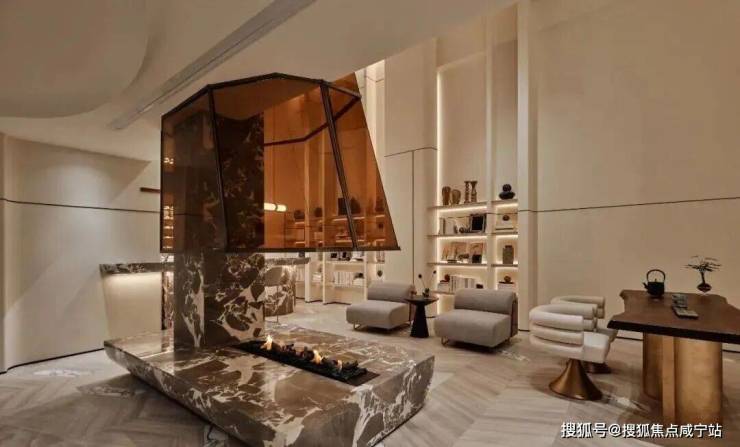 这一层更聚焦于私谈、影音、娱乐、品酒、饮茶,深沉又静谧。近6米高的垂直挑空玻璃壁炉矗立于眼前,如同一件令人赞叹不已的大型雕塑装置,它弱化了空间中的大理石承重柱,将其纳入共同构成一个完整的全新的装置,集功能性与艺术性于一身。