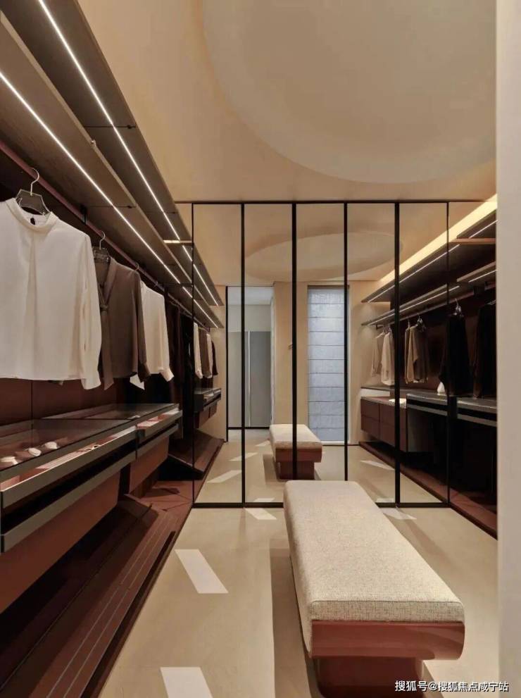 男女主人各自拥有宽敞独立的衣帽间。无论是女主人专属化妆区、贴身衣物放置区,还是沐浴前可方便拿取物品的分置区,都被悉心规划,按照丝滑的生活流程妥帖周到。