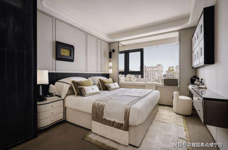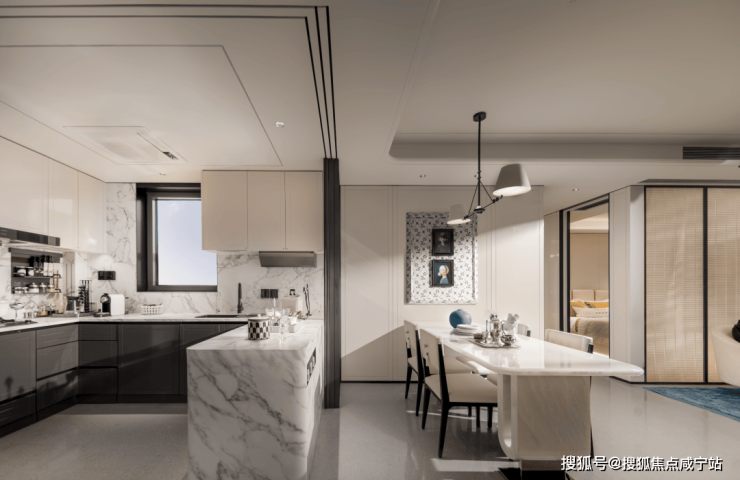 美学与场景的双重高定:摒弃传统豪宅的堆砌感,采用香奈儿式黑白撞色美学 —— 入户黑色法式镶板柜配黄铜拉手,客厅悬浮吊顶裹环形灯带,让归家仪式感如走进高端奢品店;更精准适配生活场景:主卧与北向书房的 270° 转角飘窗,将陆家嘴天际线化作 “私家画卷”,首开 2 号楼中高区业主对望陆家嘴摩登天际;超大中西岛台打破厨房 “孤立属性”,朋友小聚品酒、家人早餐互动皆能承载,让烹饪区变身社交核心。