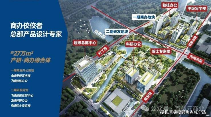 基本参数:总建筑面积约27万㎡,一期为商业办公用地(4幢甲级写字楼、7幢独栋办公);二期为研发用地(1幢超级总部中心、2幢科研办公、9幢院士专家楼)
