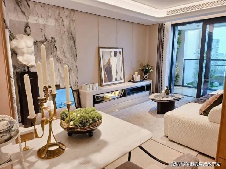 电视背景墙采用卡慕白的石材+皮革造型,弧形吊顶,相当讲究,连空调出风口的形状都打造为海上·清和玺logo山茶花的形状~~三大件为大金(或同等档次)中央空调和地暖,新风系统为百朗(或同等档次),南向阔景阳台,采光视野一级棒!海上清和玺售楼处电话📞400-8800-703如有问题欢迎来电咨询,来电即可享受买房优惠!