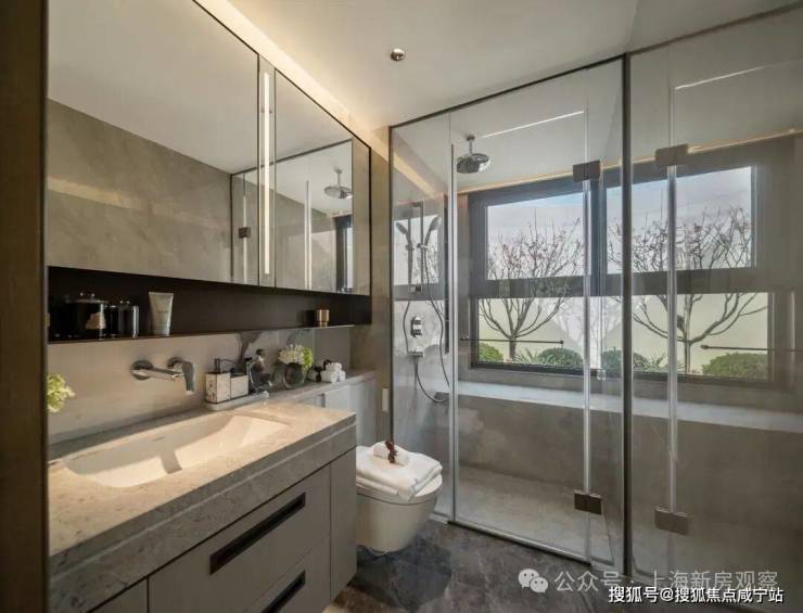 在建筑立面上,通透玻璃幕墙叠加铝板,缔就钻感镜幕墙,「江湾之钻」钻感面屏+大窗墙比,地标艺术美学,境启全新奢宅风尚。