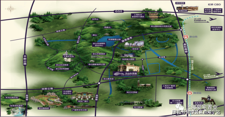 项目周边围绕佘山高尔夫俱乐部、天马山高尔夫,青青马术场、华阳马术场、佘山59号酒窖、佘山艾美酒店、月湖雕塑公园、辰山植物园、欢乐谷等旅游景观资源和休闲配套,就近即可便捷享受优质的生活。