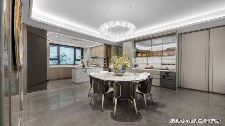 玄关、客餐联厅、厨房与阳台一体贯通,形成建面约100㎡社交巨厅,可容纳10人大圆桌,聚合社交、筵席、娱乐等多元场景,尽享欢宴与聚会。