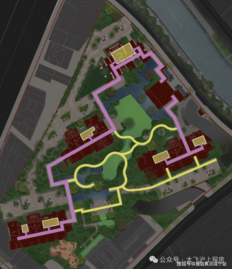 社区约3000㎡的中心花园和6大艺术花园,不仅让每栋楼都享受“楼王”的待遇,且自然勾勒出一条漫游式的公园归家动线(黄色线条走向)
