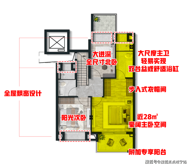 第三,二层主卧室空间更加豪华,步入式衣帽间,进深3米4的主卫,可配置双台盆及舒适浴缸,整个空间达到惊人的近28㎡。