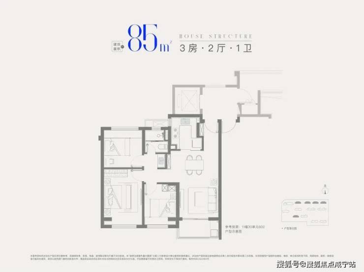 建面约85㎡3房1卫,做到三开间朝南+全卧室带飘窗+卫生间干湿分离+动静分离,非常紧凑的小3房。