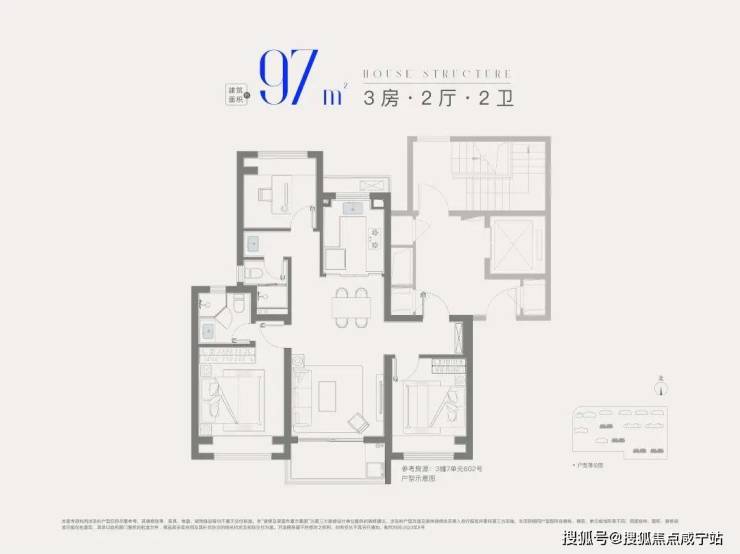 建面约97㎡3房2卫,升级版大3房,入户玄关+主卧套房设计,整体私密性更强,空间更为宽敞。