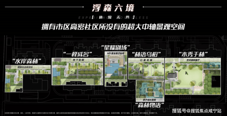 社区将自然意趣与自然景观融入园中,呈现星光森境的景观,以超长绿廊中轴为依托,缔造浮森六境璀璨盛景。