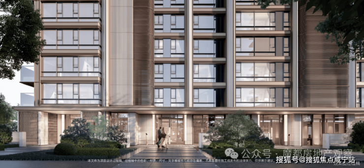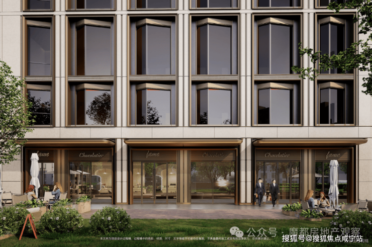 材质上,采用大面积玻璃+铝板+石材,配以雅奢香槟金暖白配色,低饱和度,质感高级,尽显品味!
