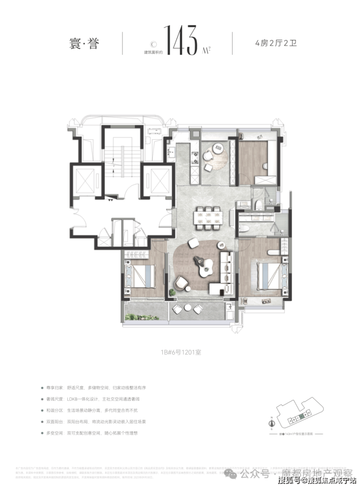 3、稀缺户型,约143㎡4房,超高实得率!板块内独一份!