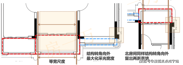 其二,卧室的短支剪力墙尽量避免向户内延伸,而是选择在外墙用造型包裹。
