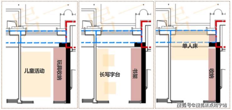 它可以是小朋友的游戏区,也可以是伴随成长的半开放书房。约2.5米的面宽,以及预留的三折叠门交标,也能独立承担单人卧室的职责。