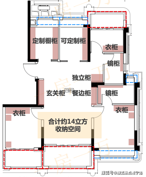 在建发海宸的这个户型中,我们细数了一下,仅根据目前的户型图推算,就能看到14立方以上的收纳容量。