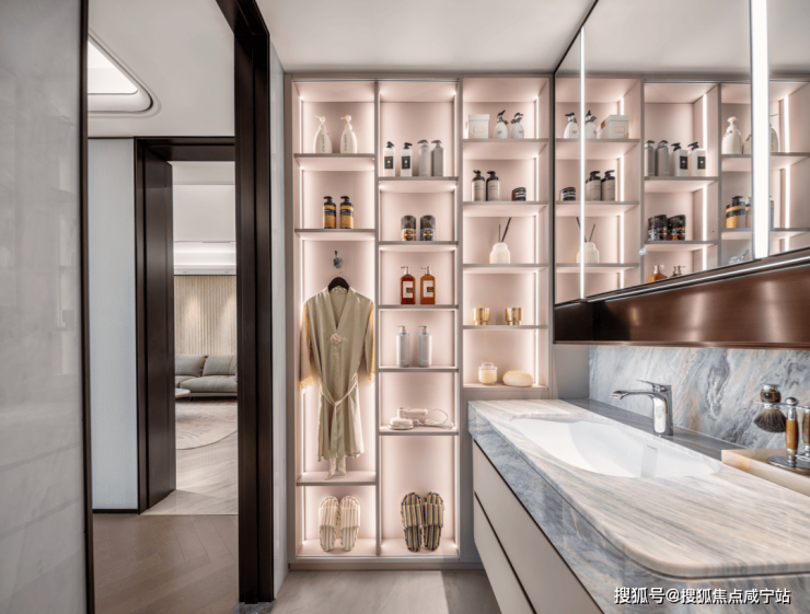 镜柜以及下面的台面延伸到马桶背后,超长柜体结合美妆冰箱、倒置抽纸等等定制分隔,功能齐备。