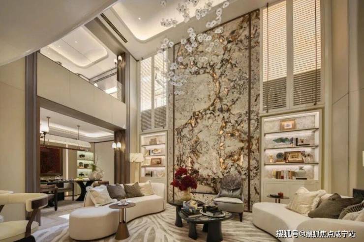 走过凌云桥,眼前便是挑高达9米、宽36米的鎏金门庭。雅柏白与香格里拉奢石镶嵌的背景墙,配合旅德艺术家LilyZhang定制的“无限云环”雕塑,气场全开。门庭两侧背景墙,选用巴西进口的整块白水晶奢石,天然石材的肌理在灯光下流转,温润如玉。当那扇手工锻打的鎏金铜门缓缓打开,对于别人是盛大的仪式,对于业主,只是日常 。