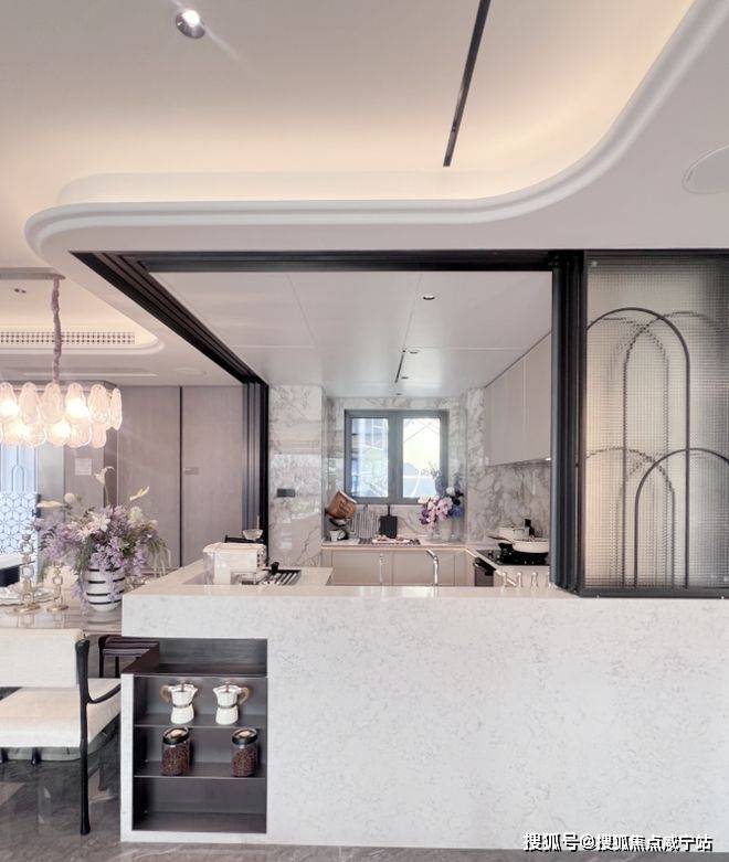 第三大亮点,就是这个厨房的设计了。与市面上常见的U型、L型厨房不同,128㎡采用了G型厨房的做法,多出的一段岛台空间,为交付标准,同时预留岛台收纳,岛台的存在,加强了家庭中人与人之间的交互,将成为未来维系家庭关系的重要纽带。