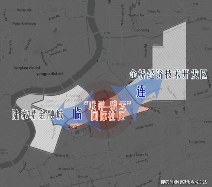 浦东新区的“联洋&碧云”国际社区,西侧“临”陆家嘴金融城,东侧“连”金桥经济技术开发区,而临港105片区数字化服务与国际社区同样北面“承”金桥研发产业,南面“接”开放区金融,两者有异曲同工之妙。