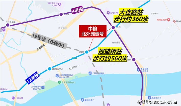交通方面:项目周围环绕三条地铁,步行约360米到4、12号线大连路站,步行约560米到12、19号线(在建)提篮桥站。