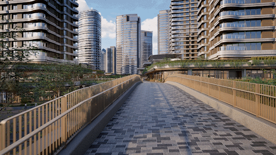 同时底盘抬高以后,每栋可以实现双入户大堂的设计,首层入户大堂净高最高约9米,二层入户大堂净高最高约4米,通过二层大堂可直接步行至社区商业,也可以通过连廊步行至滨江步道。