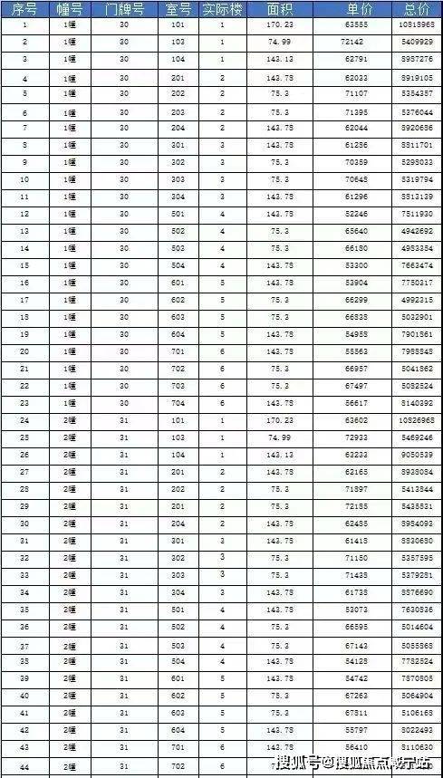 即将加推一房一价表: